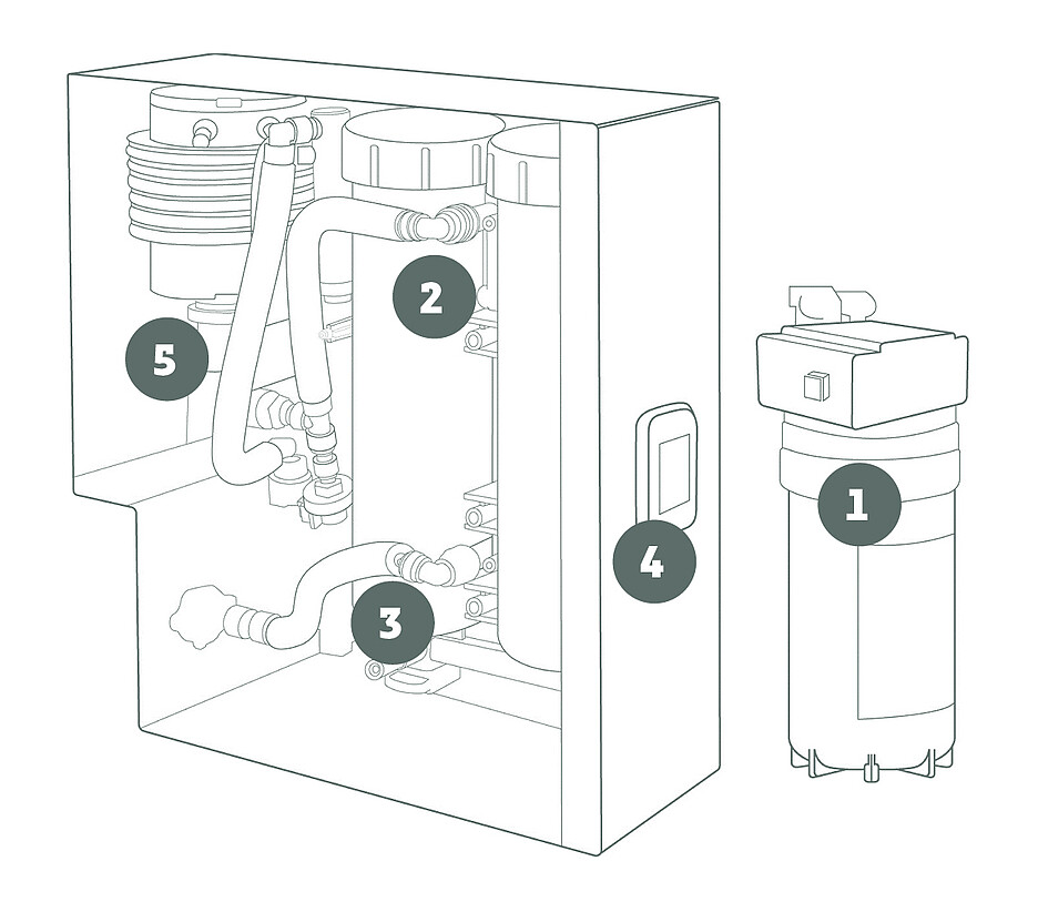 Le filtre Proguard Gastronomy 200 n’est pas intégré à la machine, mais se branche à côté – pour des raisons concrètes: par exemple, si la pompe électrique de la membrane devait tomber en panne, l’arrivée d’eau peut être déviée sur simple pression d’un bouton. Le fonctionnement de la machine est ainsi garanti jusqu’à l’arrivée d’un technicien de service. «Heureusement, cela arrive rarement», déclare Al-fred Hubli.